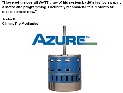 The Azure Digi-Motor is an aftermarket drop in variable speed blower motor designed to replace standard PSC and Genteq X-13 motors commonly found in air handlers, heat pumps, and fossil fuel equipment. Two dual voltage, dual rotation motors replace all applications from 1/5HP to 1HP. Azure features 4 self-programming speed taps (that auto size to the application) plus a 625 RPM continuous fan speed tap ideal for IAQ equipment as well as improved temperature destratification. If additional customizing is required, an optional hand held programmer (MARS #08502) can be used to adjust any or all of the 4 speed taps. Whether PSC or X-13, Azure wires exactly the same as the motor it replaces..